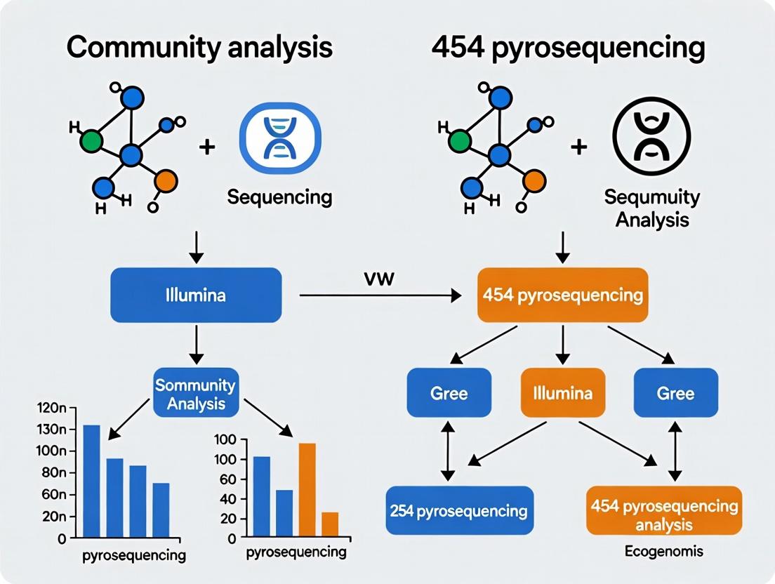 The choice between 454 pyrosequencing and Illumina for community analysis is not merely historical but informs how we interpret existing datasets and design future studies. While Illumina's superior throughput, lower cost, and higher accuracy have made it the industry standard, understanding 454's legacy—particularly its longer reads—is crucial for contextualizing a vast body of published research. For drug development and clinical research, Illumina's scalability enables robust, large-scale biomarker discovery and therapeutic monitoring. Future directions point towards hybrid approaches, leveraging the long-read capabilities of platforms like PacBio or Oxford Nanopore to ground-truth short-read Illumina data, and the integration of multi-omics to move beyond taxonomy to functional insights. Ultimately, a nuanced understanding of both technologies empowers researchers to extract maximum value from past investments and make informed, cutting-edge choices for unlocking the therapeutic potential of microbial communities.