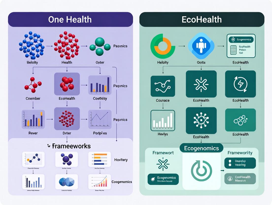 | Defining Goal | To achieve optimal health outcomes for people, animals, plants, and their shared environment through collaborative, cross-sectoral efforts. | To understand and promote the health of humans, animals, and ecosystems as interconnected entities within socio-ecological systems. |